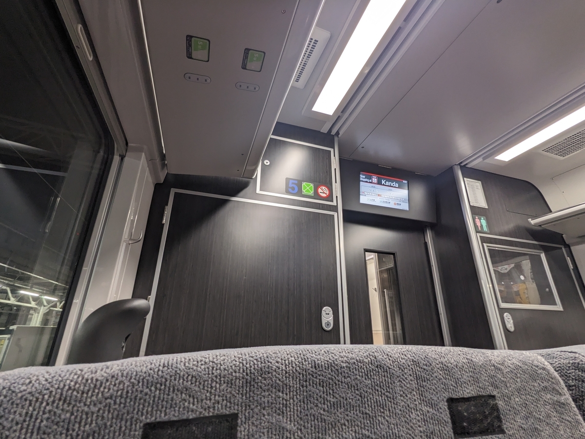 すっごくひろいなー。この席。しかも乗務員さんとお見合いだよ。
