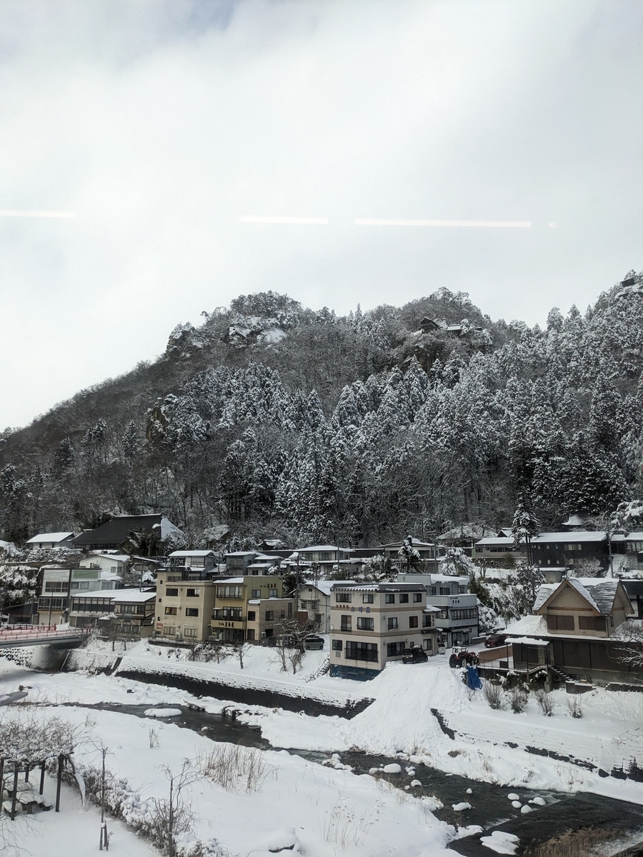 そんなこんなで陸羽東線のハイライト、鳴子峡を通過。ここでは観光列車らしく徐行してくれます。ですが、走行中に巻き上げられた雪が窓にこびりついたまま凍ってしまい見づらい...